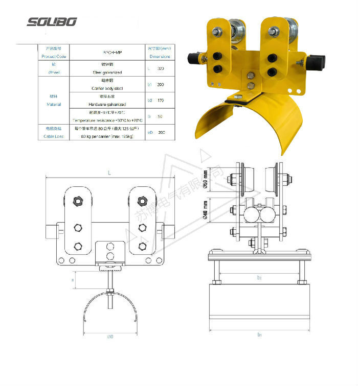工字鋼電纜滑車分為中載荷型、重載荷型和輕載荷型,因此滑車行走輪為86、73、55的三種,承載能力小于等于50-150KG每類按托板層數(shù)分為單層、雙層、三層,每類中有三種形式,首端為電纜牽引車,終端為固定掛線架,中間為工字鋼電纜滑車。